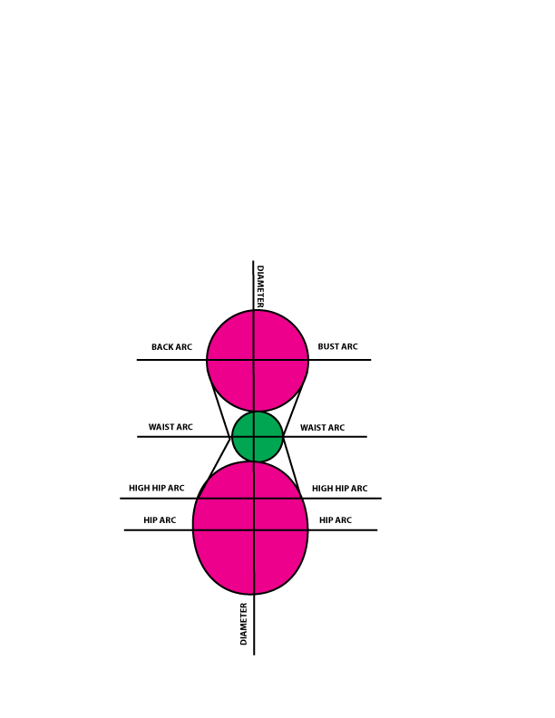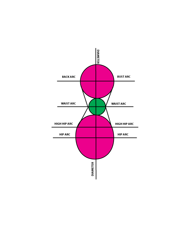 So, when we refer to bust arc, back-arc, waist arc, high-hip arc, and hip arc, it simply means that we will be measuring a “QUARTER SECTION” of the circumference [diameter] of the torso, meaning we only measure from the center front or center back to the side of the front or back of the body.