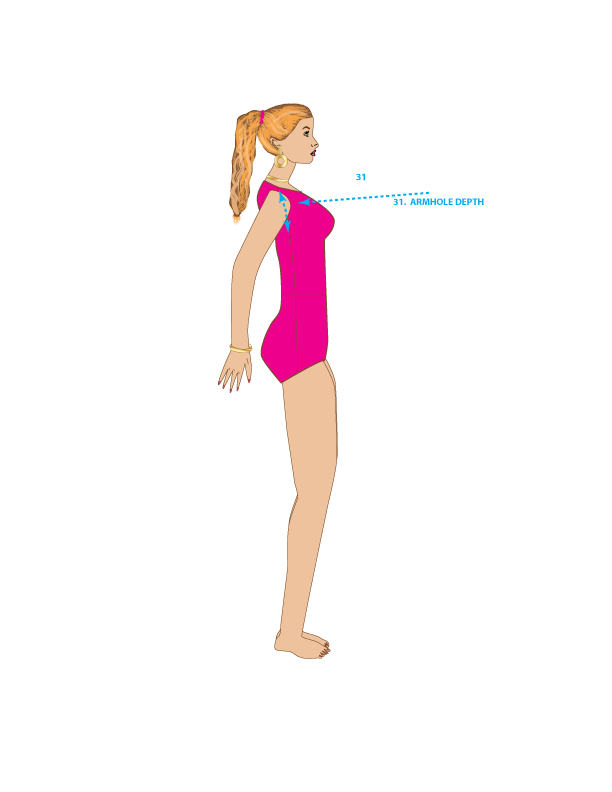 31. ARMHOLE DEPTH – Measure the front and back armhole depth from the shoulder tip to 1/2 – 1-inch below the bottom of the armpit at the side seam.