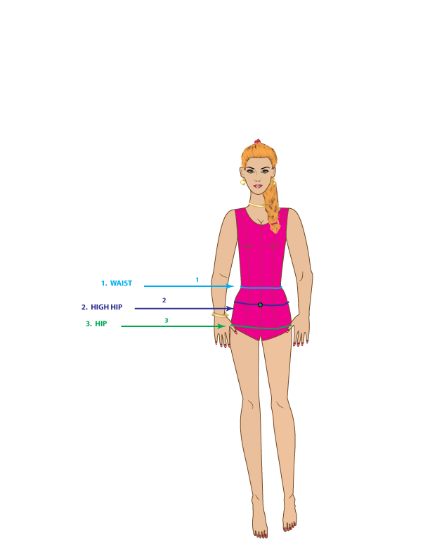 5. HIGH HIP – Measure from the center front high hip to the side on the high hip line, starting 3-inches down from the center front waist