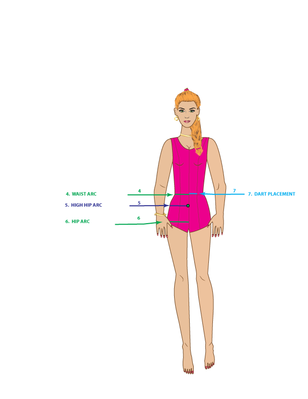 5. HIGH HIP ARC – Measure from the center front to the side seam, starting 3-inches down from the waist