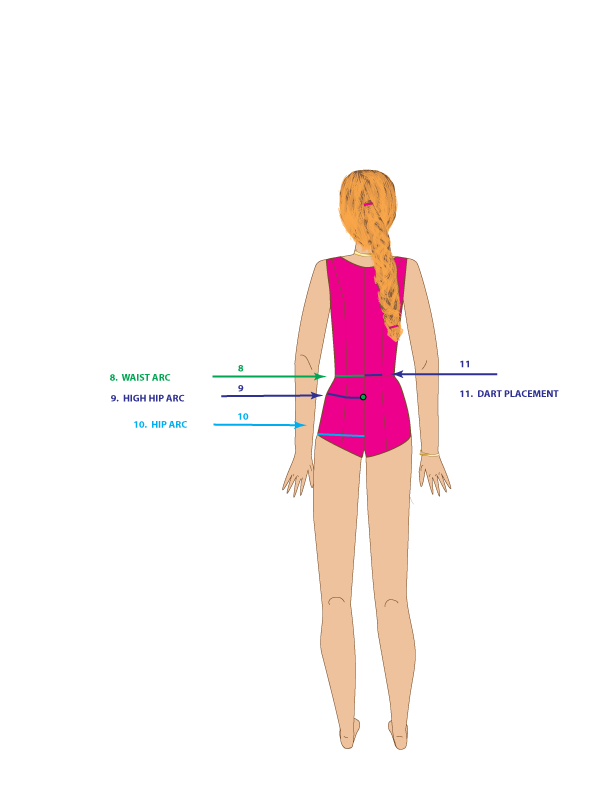 9. HIGH HIP ARC – Measure from the center back high hip to the side on the high hip line, starting 3-inches down from the center back waist