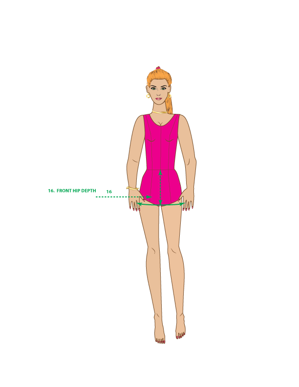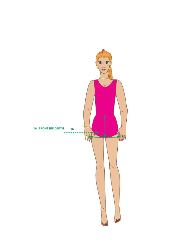 16. FRONT HIP DEPTH – Measure from the center front waist down to the hip line