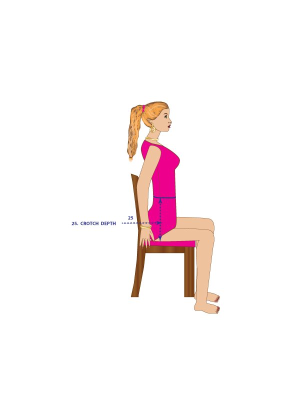 25. CROTCH DEPTH – Place a belt or strip of elastic around the waist, measure below the belt/elastic to the base of the chair