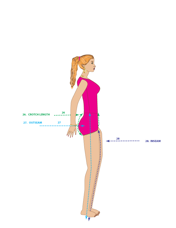 26. CROTCH LENGTH – Measure from the center front waist under the crotch [between the thighs] to the center back waist